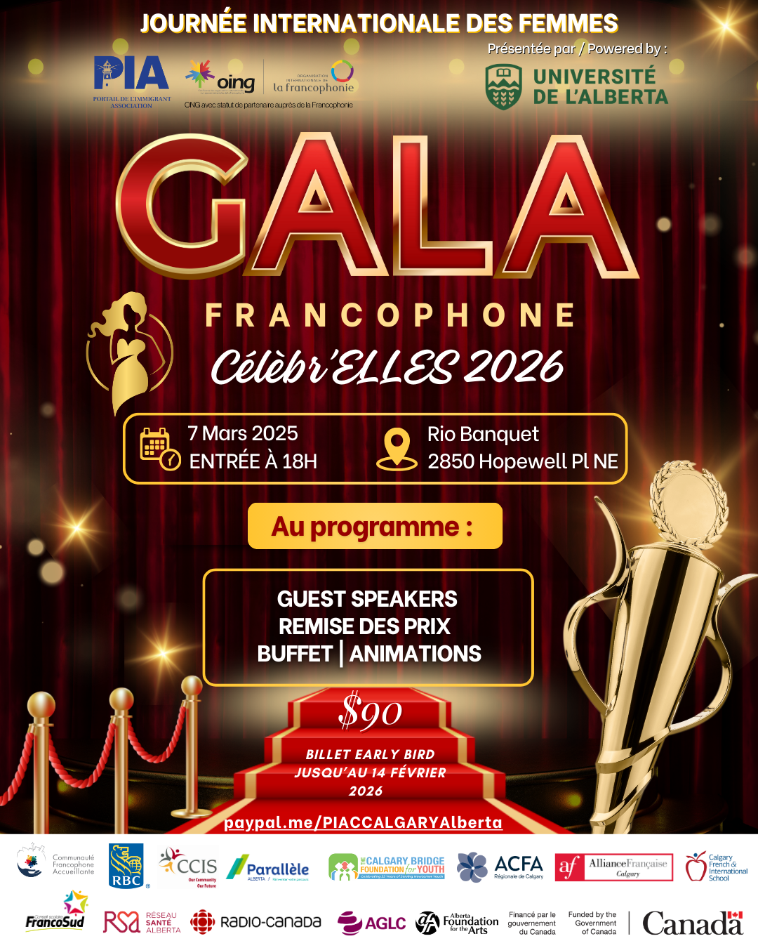 Organisé dans le cadre de la Journée internationale des femmes, le PIA poursuit sa tradition de reconnaître et de célébrer l’apport des femmes et des filles de nos communautés, issues de divers secteurs, lors du Gala Francophone Célèbr’ELLES 2026. Cet événement est présenté par l’Université de Calgary – Campus Saint-Jean.